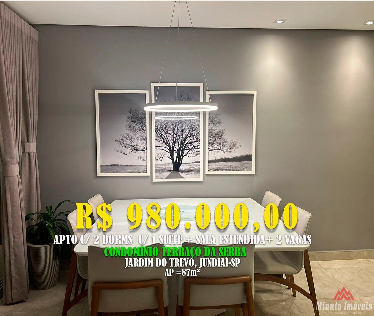 terraço da serra - Jardim Trevo - Jundiaí/SPApartamento 87m² c/ 2 Dormitorios, Sala estendida (3 ambientes) c/ Vagas de Garagem. Loc: Condomínio Terraço da Serra, Jardim do Trevo-Jundiaí/SP Valor = R$ 980.000,00
