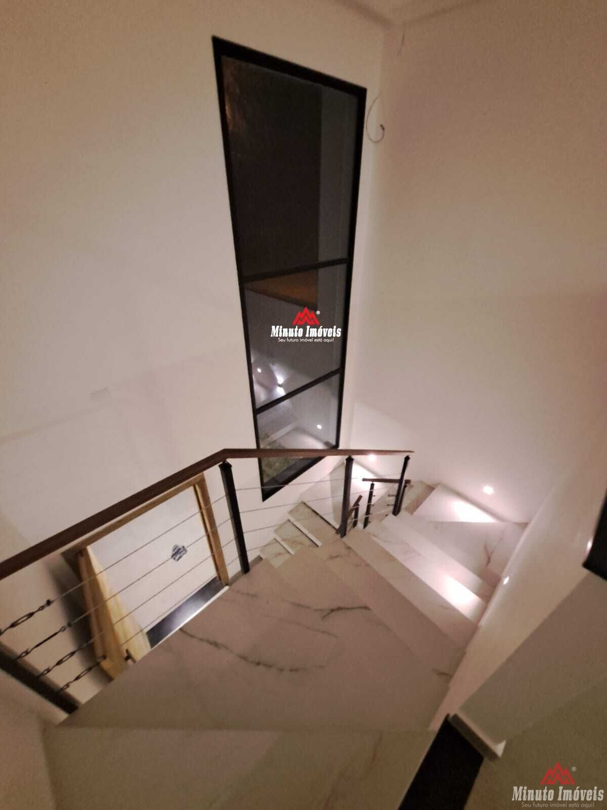 - Hall de entrada com escada suspensa, acabamento de porcelanato de 1,20x0,60cm e guarda corpo moderno em madeira de lei e cabos de aço.